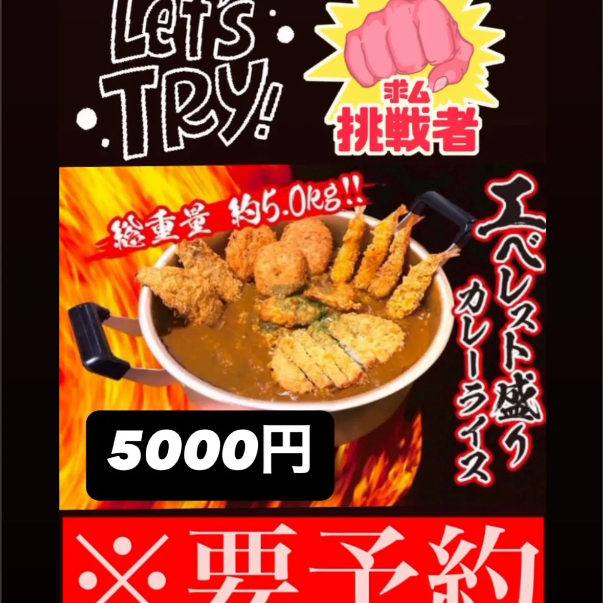 話題の5キロカレー⁉️💦その名はエベレスト盛カレー🍛総重量5キロのカレーライスになります🔥チャレンジャー募集中です🇯🇲1人チャレンジは1時間以内で完食で無料。(ご無理はされないように😓)家族や友達とチ…